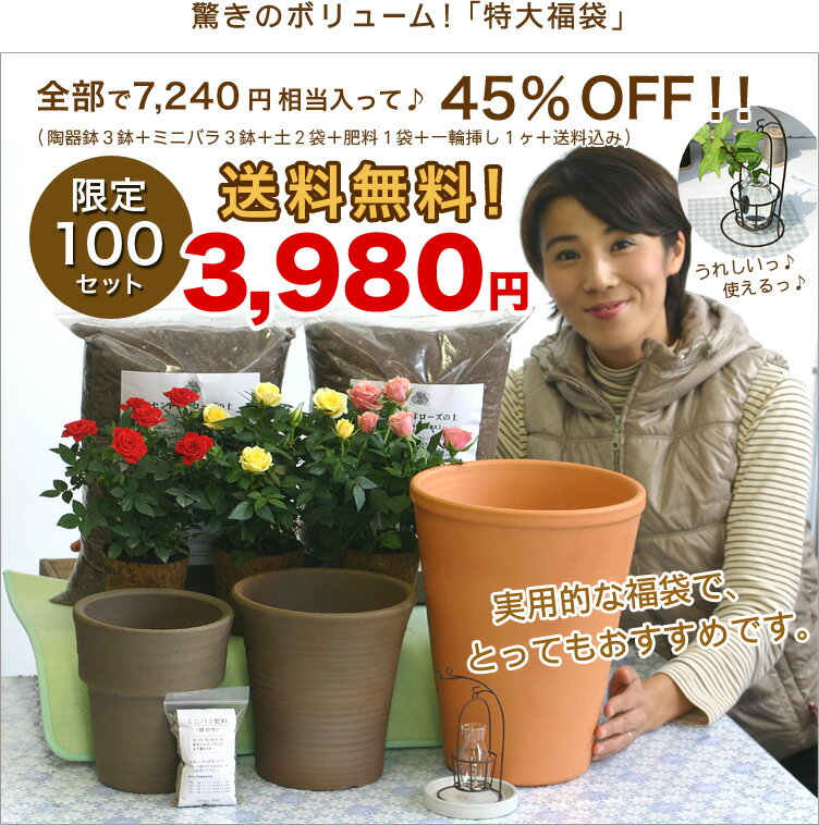 【送料無料】驚きのボリューム★特大福袋★ 価格: 3,980円 レビュー評価: 0.0 レビュー数:0 ミニバラ3鉢・陶器鉢3鉢・土2袋・肥料・その他!実用的で使えるものが、どっさり入った、とってもお得な福袋セットです♪商品形態ミニバラ福袋セット内容ミニバラ(ココポット仕様)3鉢 / 陶器鉢(大・中・小)各1鉢 / 土(8L)2袋 / 肥料200g / 一輪挿し1点 / ガイドBook等 日にち指定 不可時間指定可能 管理方法 環境の変化に順応させてから、屋外で管理して下さい。★★★ご注意?必ずお読み下さい。★★★●花は生き物です。株立ち・開花状況等が掲載写 真と異なる場合がございます。●ミニバラの品種・花色・一輪挿し等は、お選び いただけません。予めご了承ください。●備考欄にお届け日やミニ Supported by 楽天ウェブサービス |